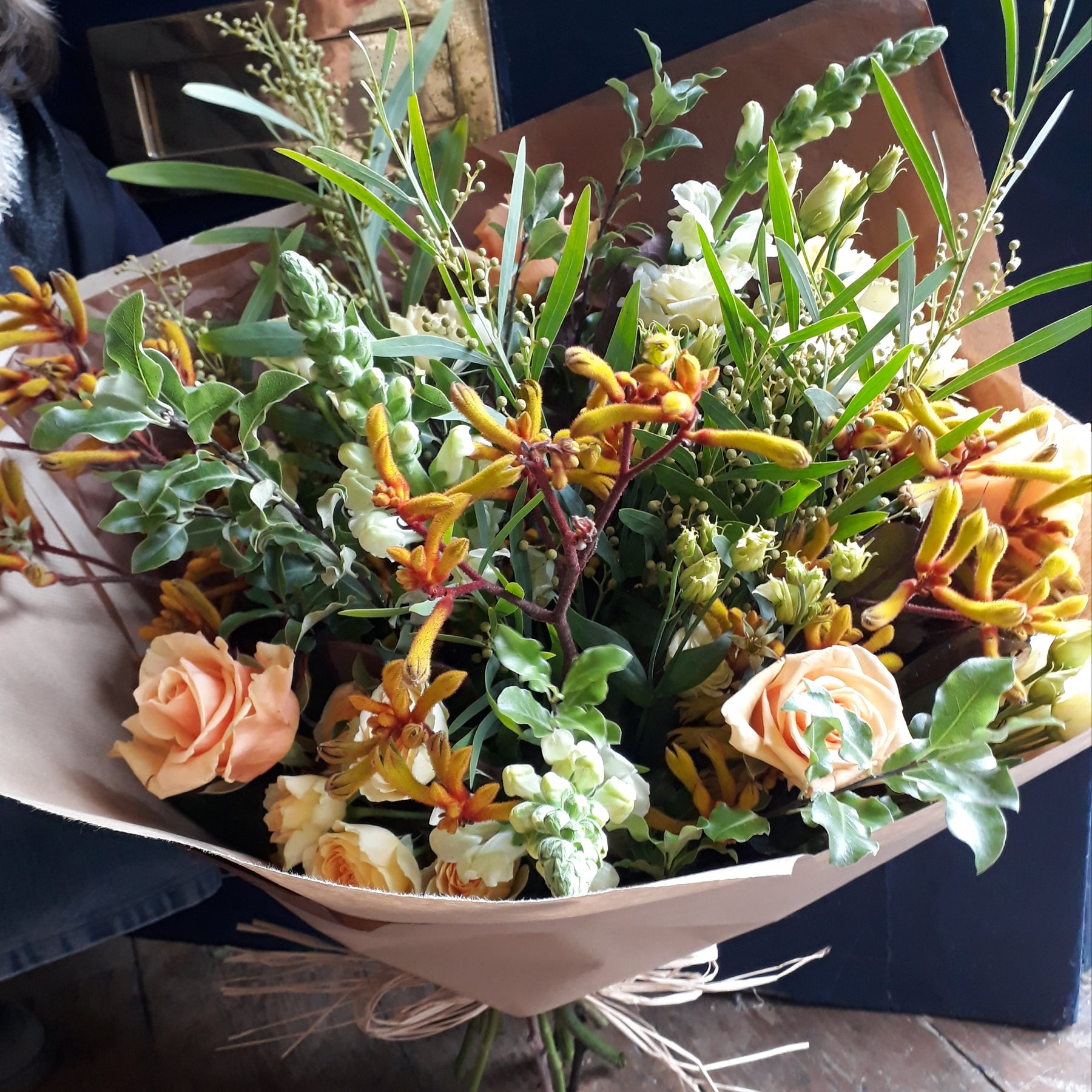Our seasonal bouquets feature rich oranges, peaches, and golds, blended with deep greens and variegated foliage, all wrapped in brown kraft paper and tied with natural raffia.